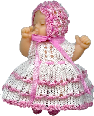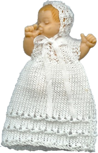 Materials required: DMC 80 cotton, size 20 knitting needles, 2 buttons and 2mm silk ribbon.