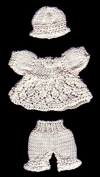 Short Lozenge Dress for 2" DollMaterials Required: DMC 100 cotton or Venne Colcotton 70/2, size 19 knitting needles and 2 buttons. |