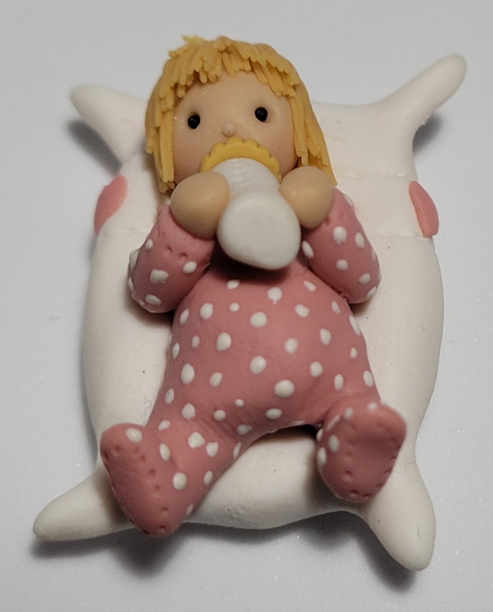 Little Girl on Pillow This little girl lying on a pillow was created in fimo by Manda Theart of South Africa. Approx 1cm in height and max width of 3cm. ![]() |